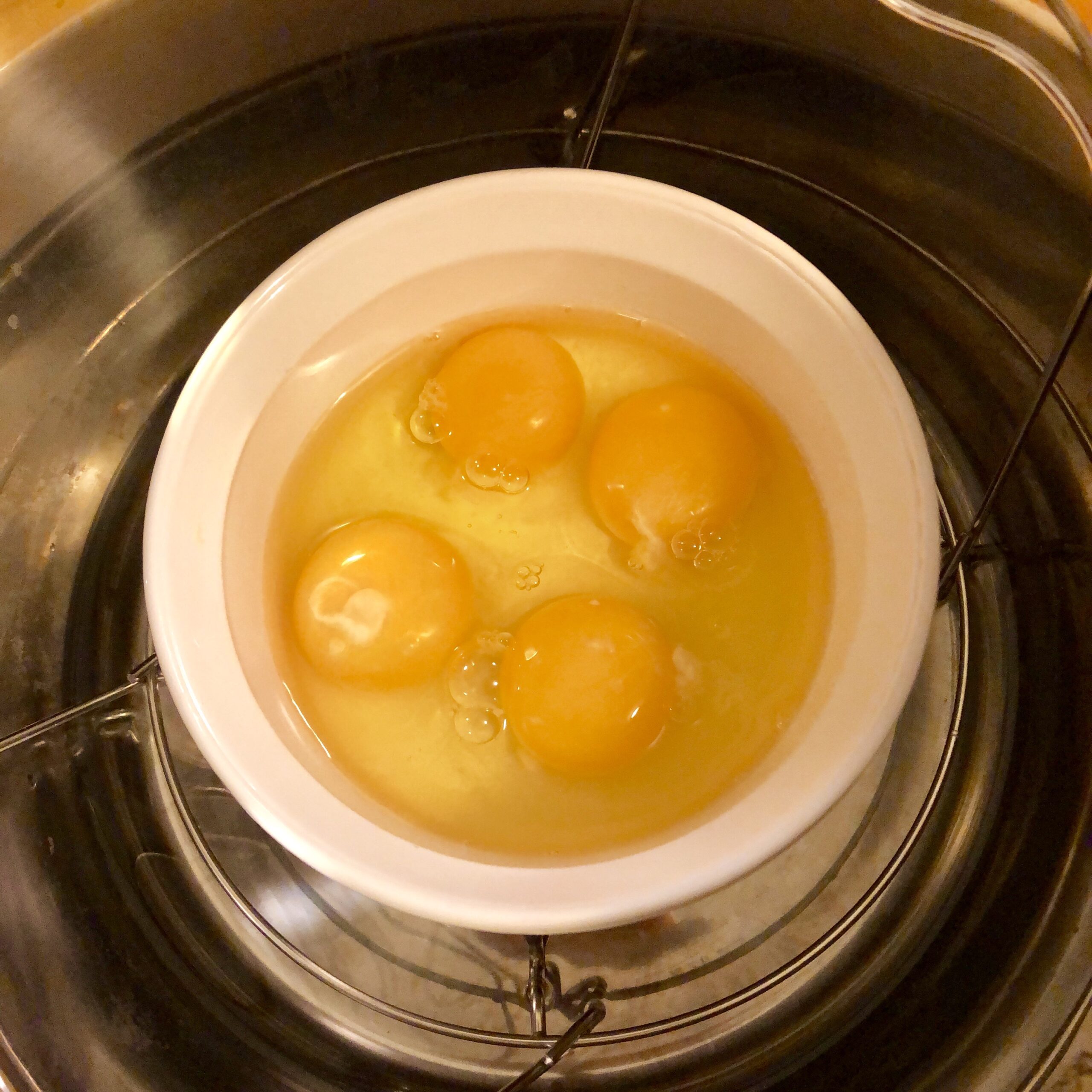 Crack eggs into the dish, then set it on top of the trivet inside the pot.