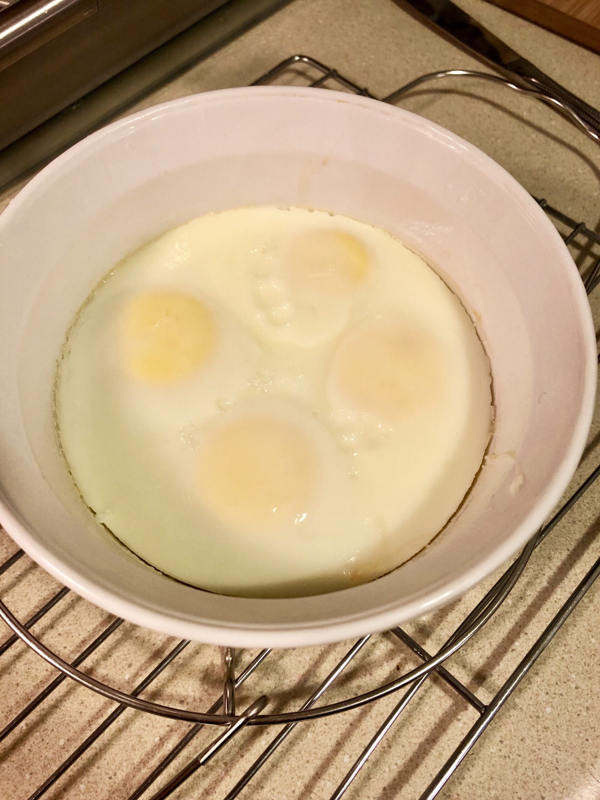 *I only needed 4 eggs, and have not tried this method with more or in a larger dish, but I suspect you will require an extra couple minutes of pressure cooking for the larger quantity…if you try it let me know the results